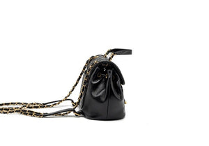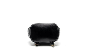 The drawstring closure features double gold beads, a standout detail that adds a subtle touch of glam. With a convertible leather-woven chain strap, it transitions effortlessly from shoulder bag to backpack, making it both practical and iconic.