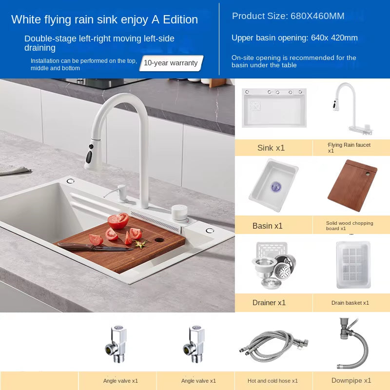 Upgrade your kitchen with this multifunctional white stainless-steel sink set, designed for both beauty and practicality. With a smooth finish and durable construction, it includes everything you need for a seamless kitchen setup — faucet, chopping board, drain basket, and accessories for easy installation.